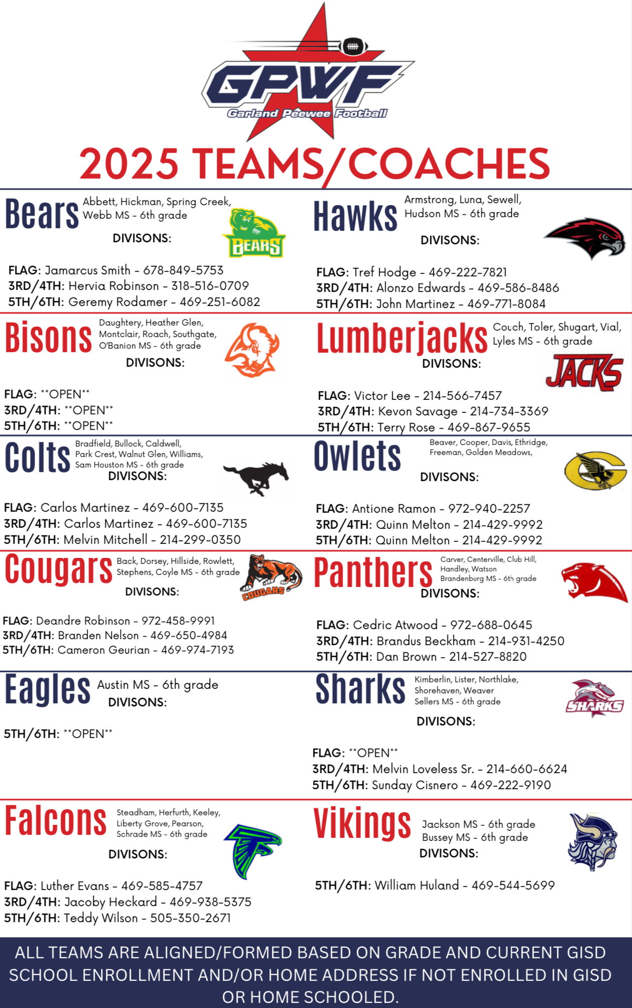 ALL TEAMS ARE ALIGNED/FORMED BASED ON GRADE AND CURRENT GISD SCHOOL ENROLLMENT AND/OR HOME ADDRESS IF NOT ENROLLED IN GISD OR HOME SCHOOLED.